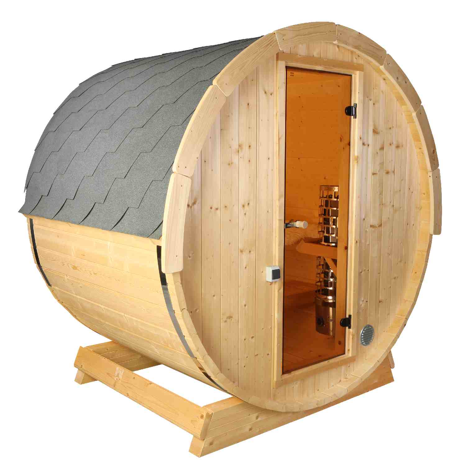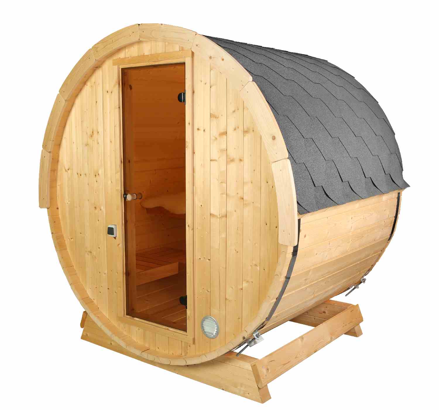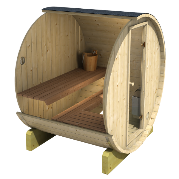 Een ruime barrelsauna met glazen deuren en een volledige achterbank met een totale lengte van 160 cm. De sauna is geschikt voor 3 tot maximaal 4 personen. Het is gemaakt van hoogwaardig sparrenhout.