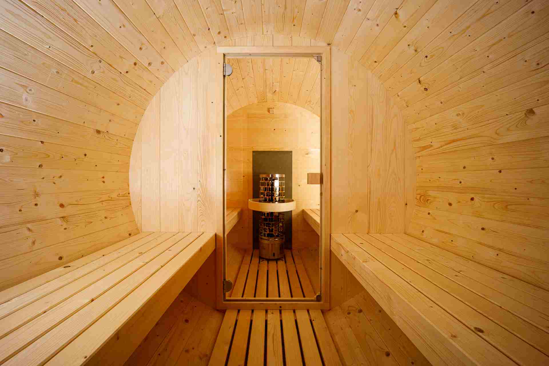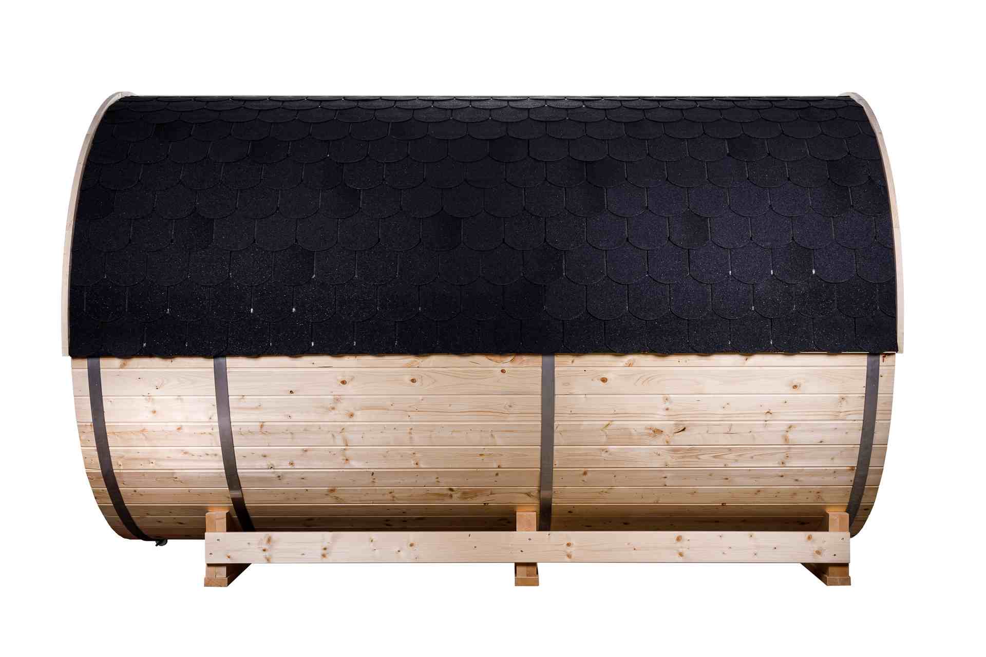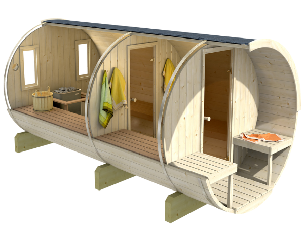 Ruime barrelsauna met buitenzitplaats met glazen deuren met een totale lengte van 330 cm met binnen een ontspanningsruimte. Het is geschikt voor 4 tot 6 personen.