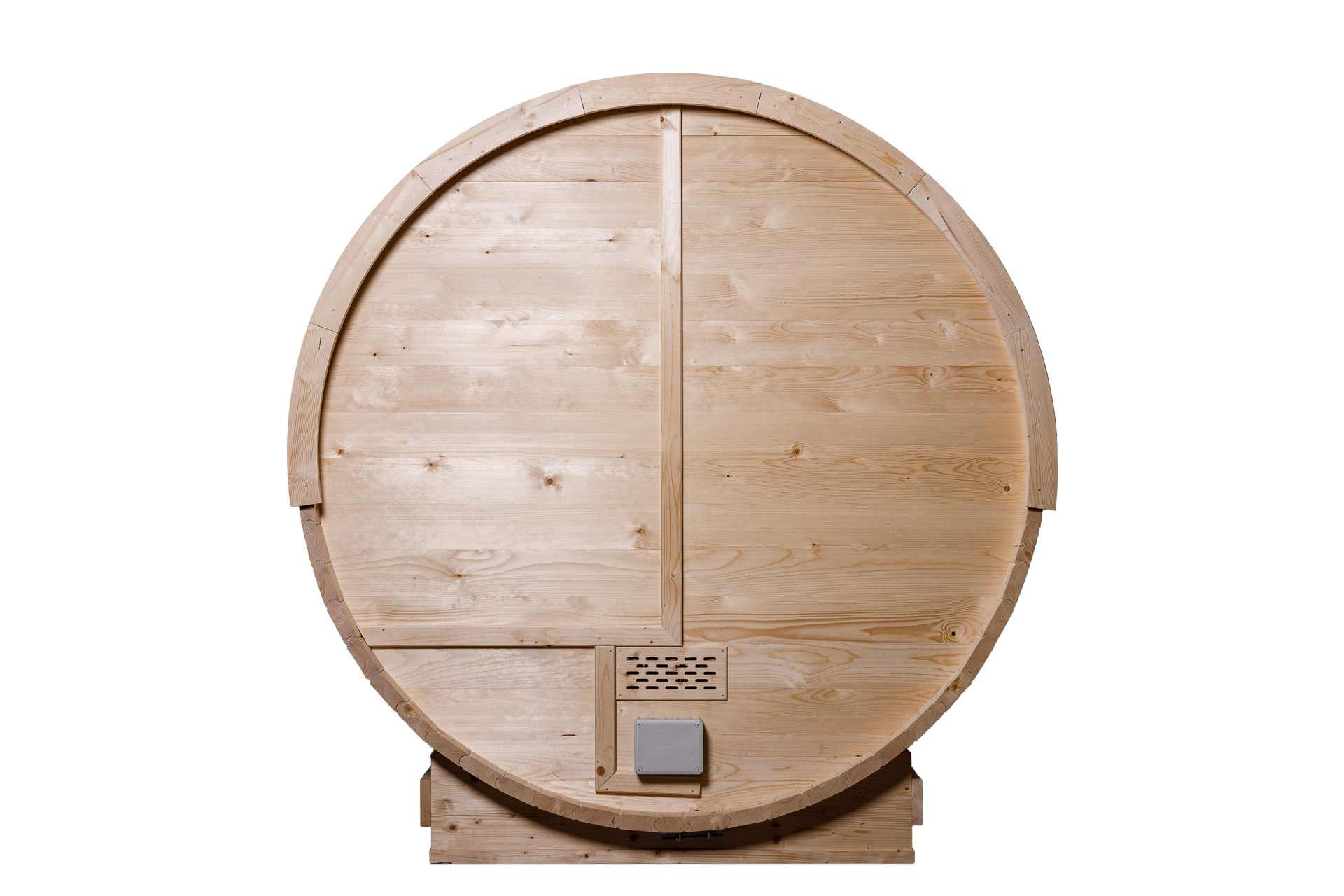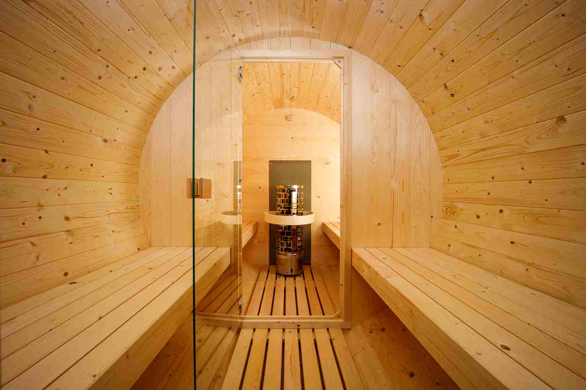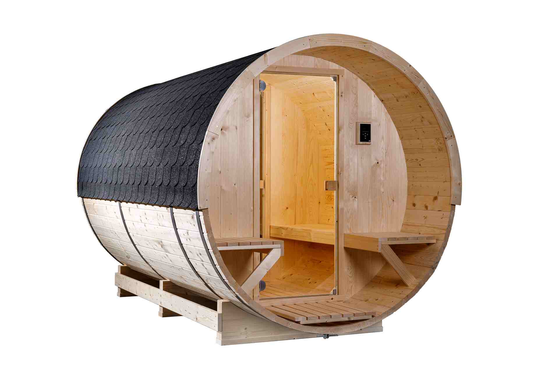 Ruime barrelsauna met buitenzitplaats met glazen deuren met een totale lengte van 330 cm met binnen een ontspanningsruimte. Het is geschikt voor 4 tot 6 personen.
